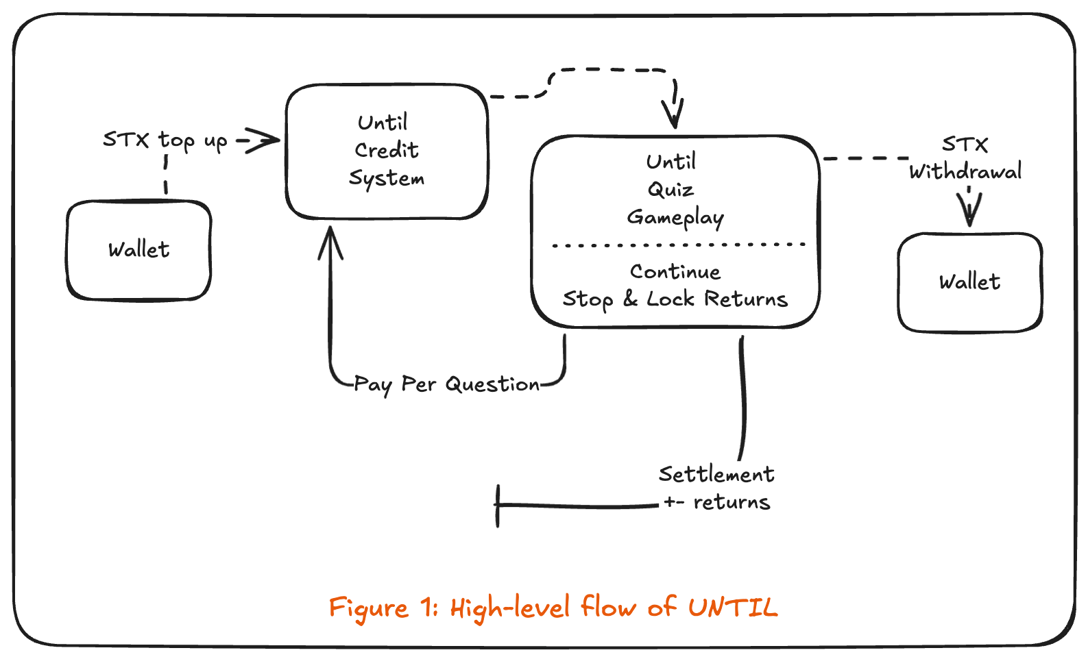 UNTIL is a skill-based quiz platform where every question is a paid economic decision on the Stacks blockchain. Players top up once in STX, play from an in app credit balance, and earn or lose based on correctness, speed, and critically when they choose to stop. The system uses HTTP 402 Payment Required (x402) and on-chain verification for top-ups and withdrawals; scoring and payouts are deterministic and server authoritative. UNTIL does not issue its own token, does not charge a platform fee, and is designed around optimal stopping theory: players win by stopping at the right moment, not by luck. This document describes the current architecture, tokenomics, credits flow, question system, and a roadmap including scaling (K tiers), subscription tiers, social/challenge modes, AI evolution, quality improvements, streak incentives, governance, programmatic x402, and mainnet deployment.